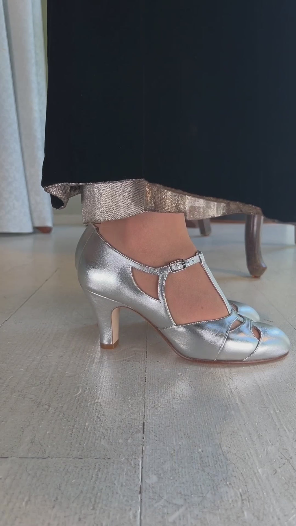 Helen is a vintage-inspired evening shoe that captures the elegance of the late 1920s and early 1930s. Featuring the iconic T-strap elegantly fastened with a single buckle at the ankle, this design is both timeless and refined. Feminine cutouts on the vamp and a high, gracefully curved Spanish heel evoke the era's glamour, while the almond-shaped toe with a subtle point adds sophistication.