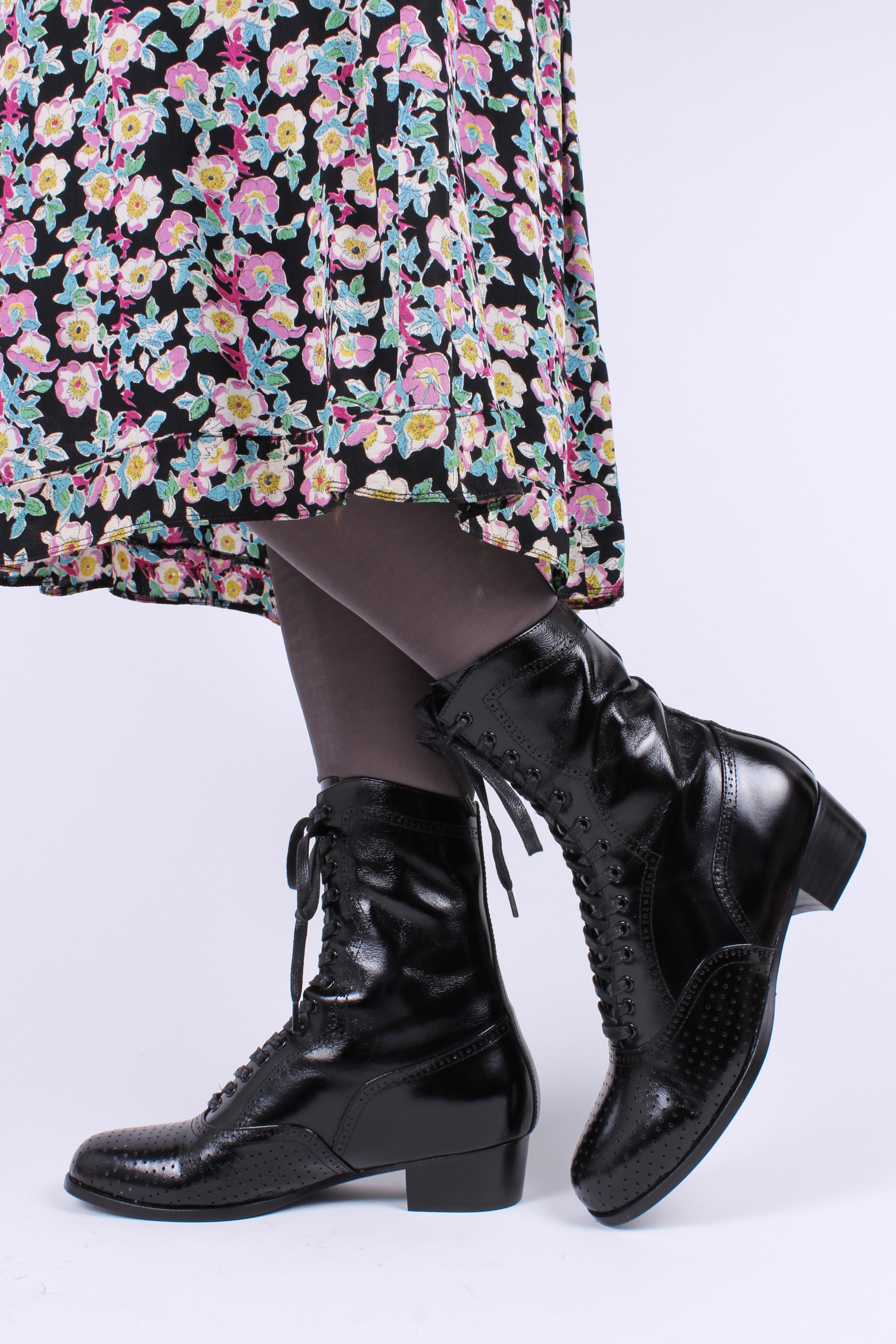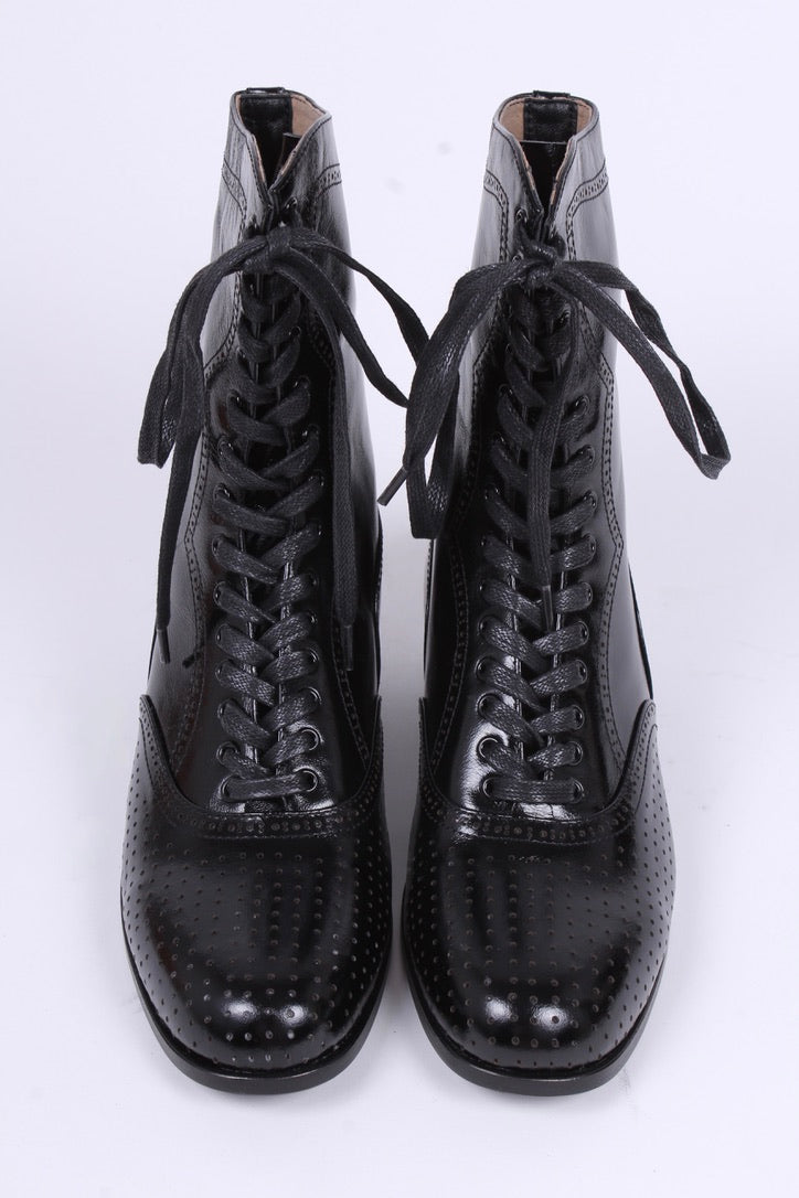 A practical lace-up leather boot, inspired by the styles of the 20s and 30s, crafted with black leather and an original vintage hole pattern. The roomy, round-toed design has a heel height of 3.5 cm for added comfort and stability. Shoelaces are made of long cotton with off-white canvas lining inside, providing a classic look akin to the original boots of the era.