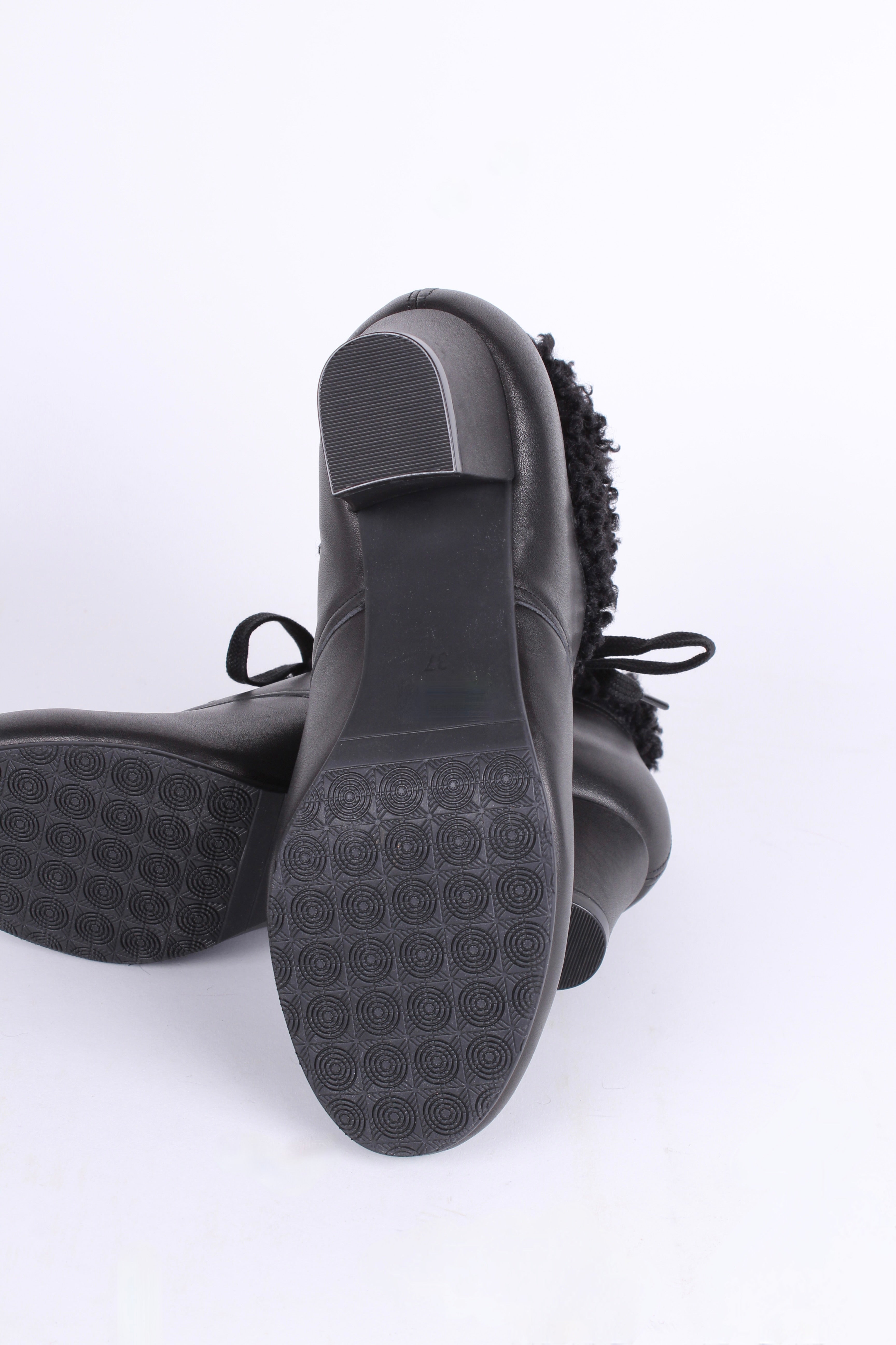 These feminine and cute ankle lace-up booties feature a medium-high, solid heel and a round, spacious toe cap that provides comfortable room for the toes. The upper is crafted from full-grain leather, and the exterior features artificial fur. The interior is lined with soft, breathable, and warm natural wool shearling. The boots are fastened with cotton laces.