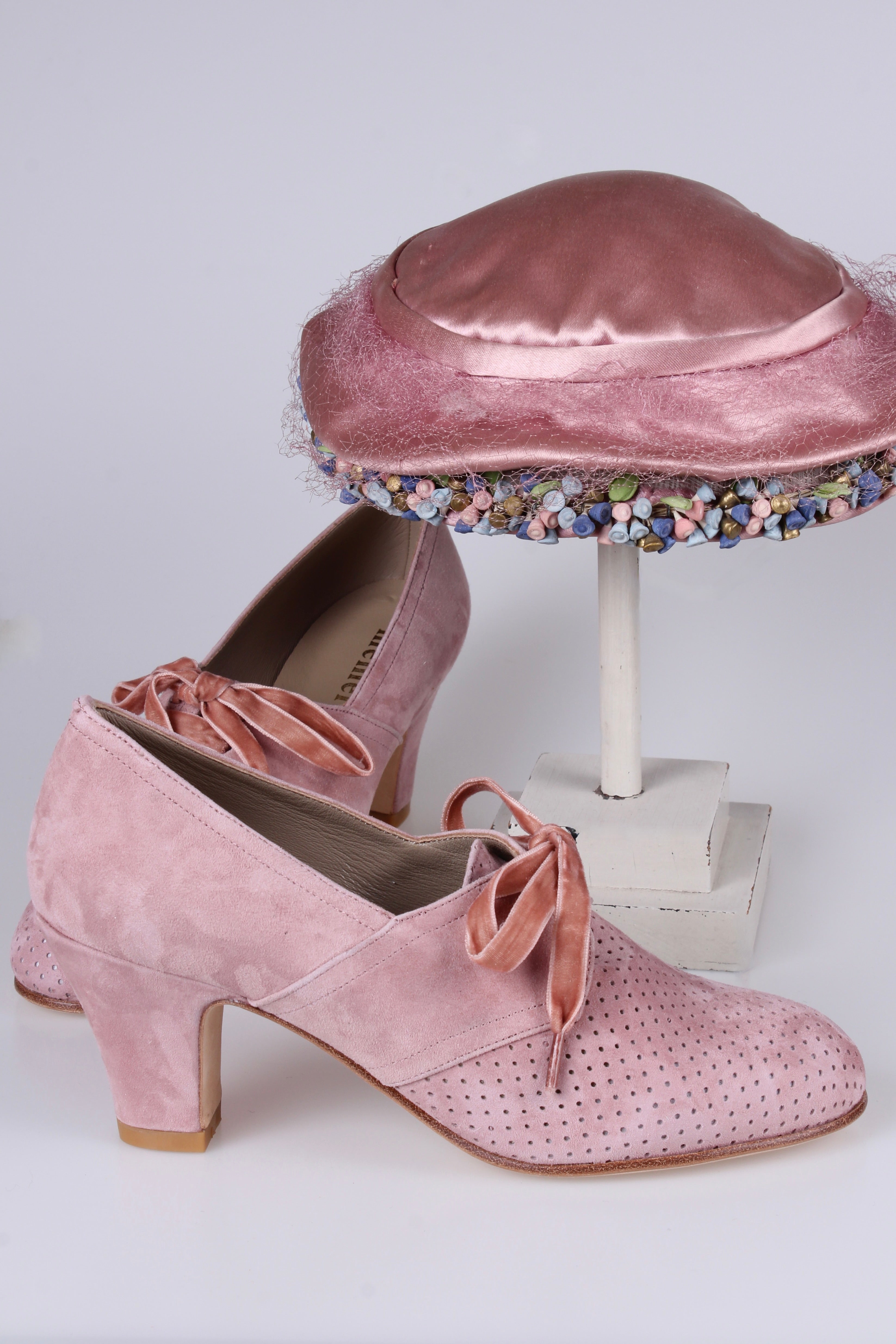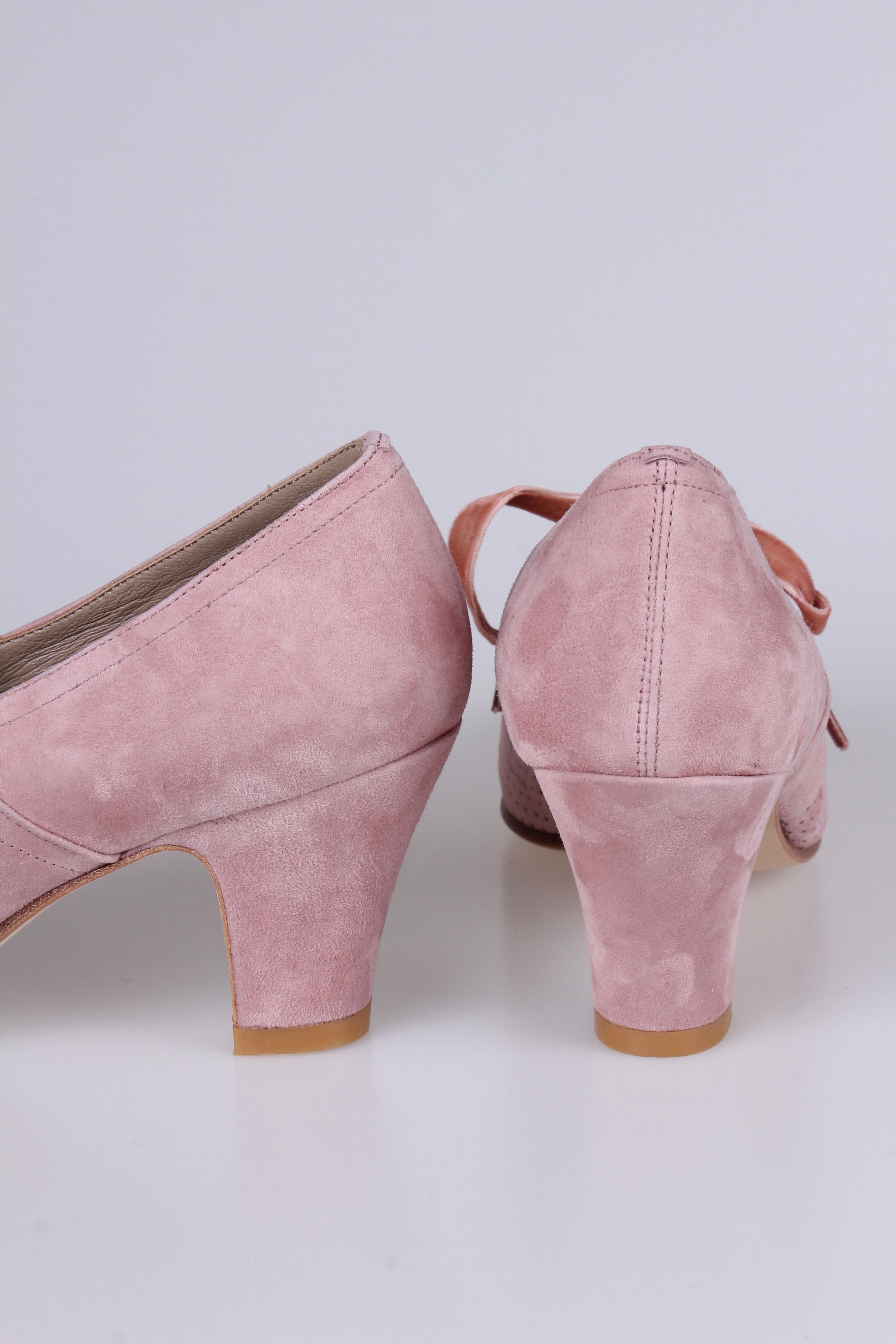 1940s pumps in suede with velvet laces - Powder Rose - Esther