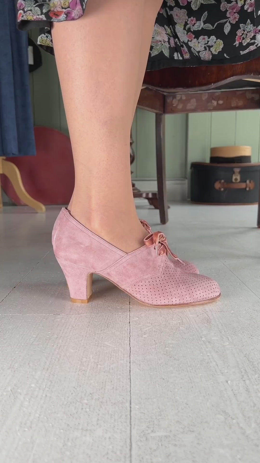 I can't say enough about how beautiful this 1940's suede Esther pump is in Powder Rose. It is a very soft pink with lovely velvet shoe laces. The fit and comfort are perfect. I could not be happier with this selection.