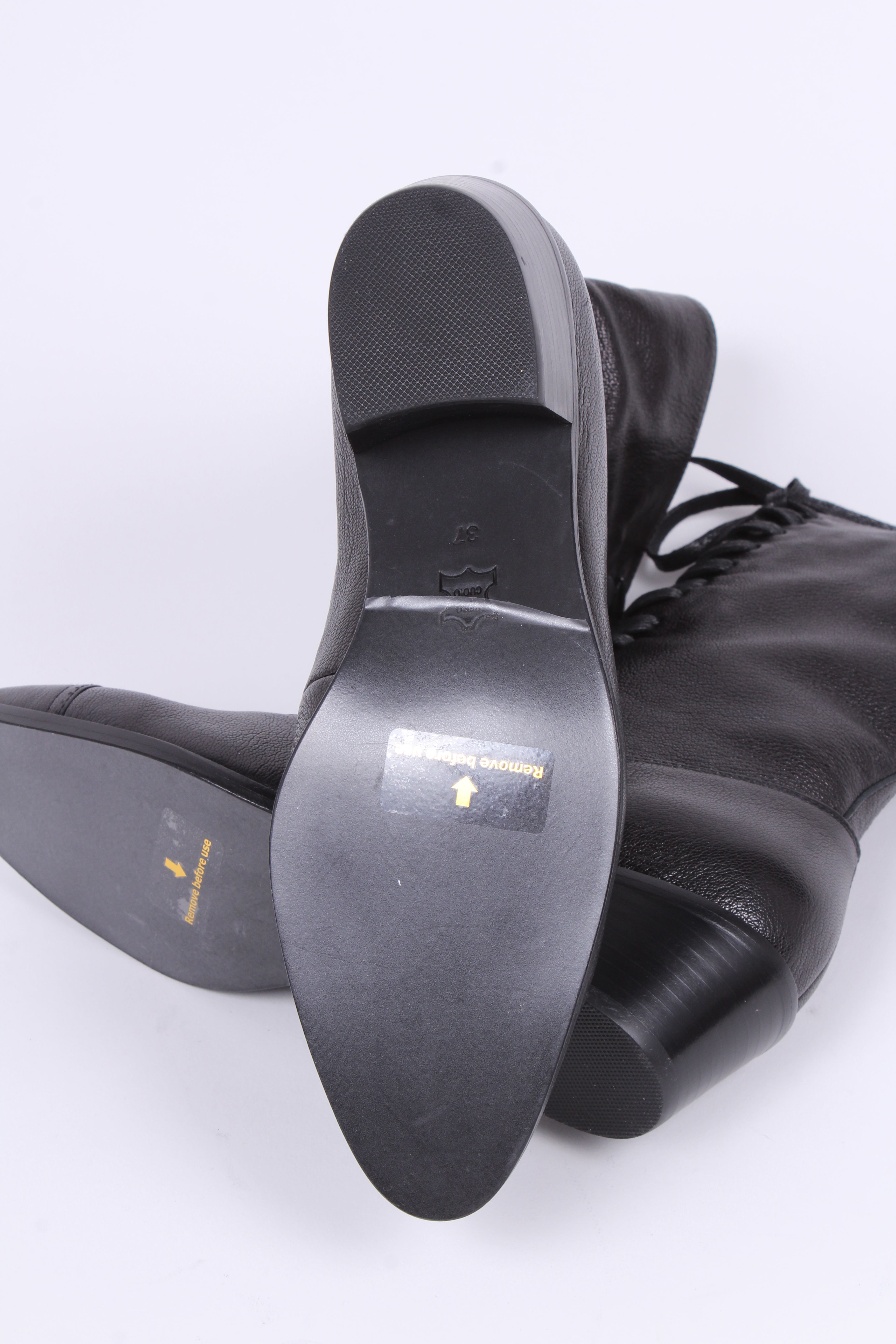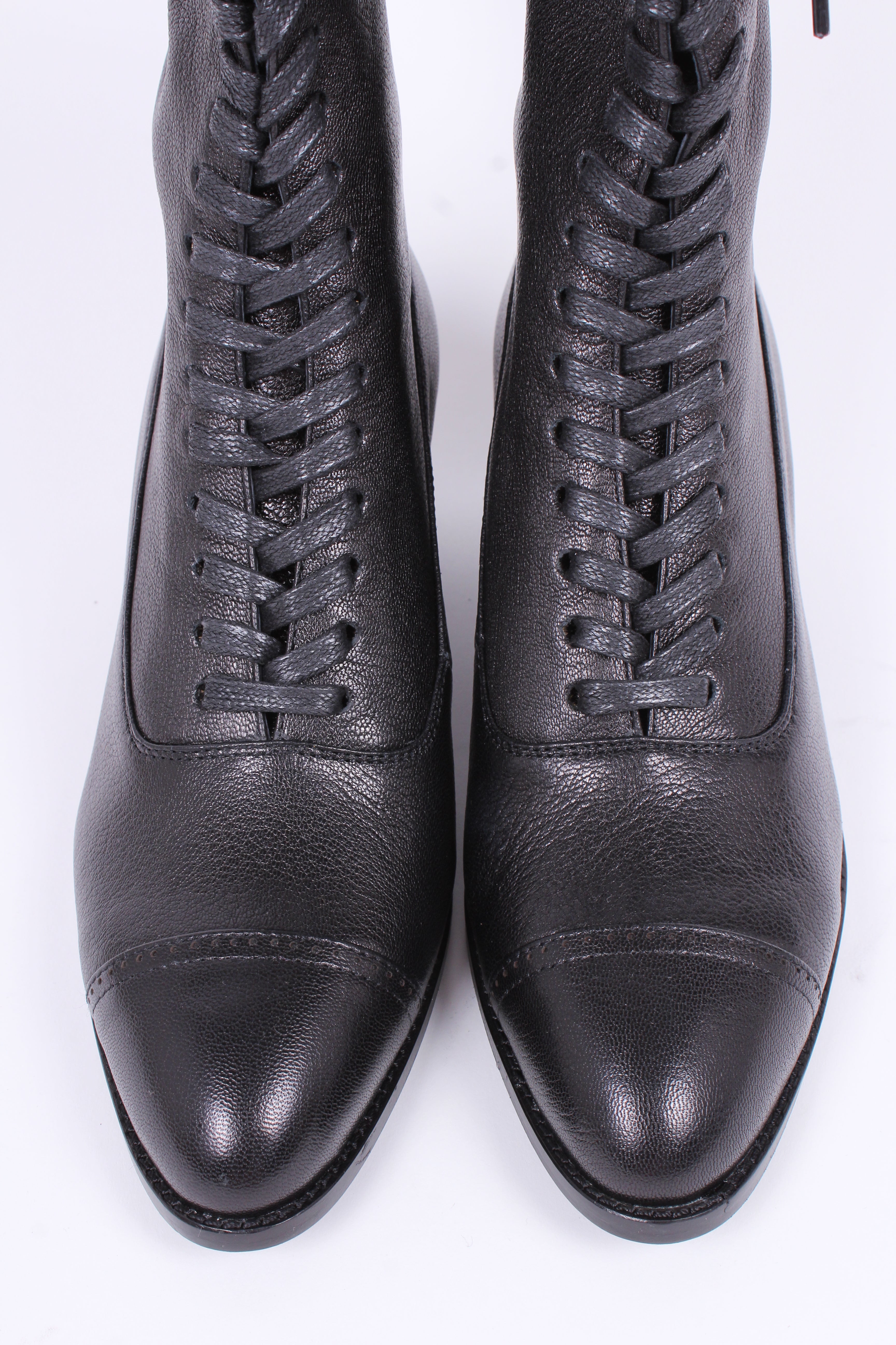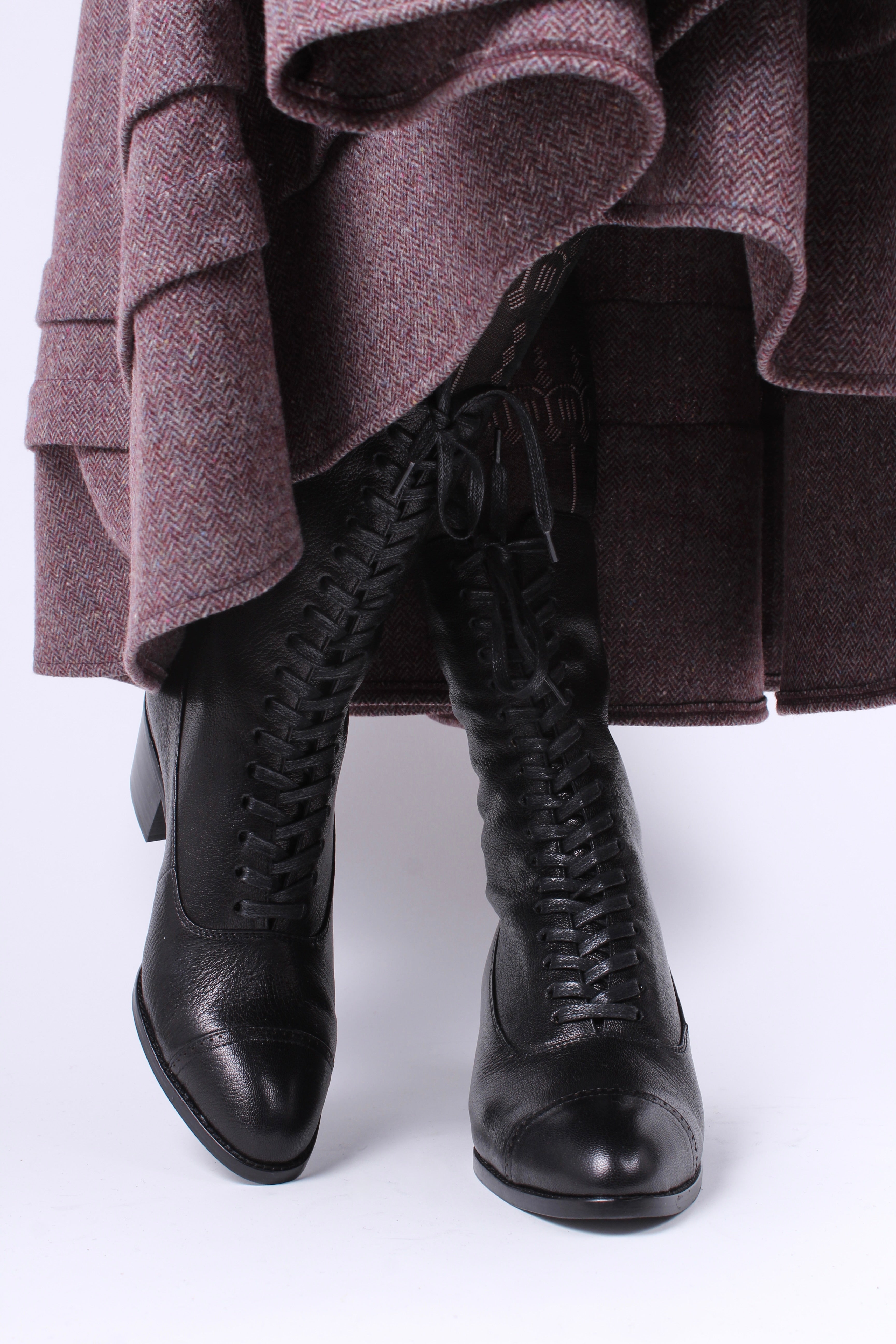 The boots are typical Edwardian style with a pointed toe and a 5,3 cm high heel. The boot shaft is slim fitting with lots of eyelets for the long shoe laces in cotton. Around the toe, there is a delicate hole pattern.