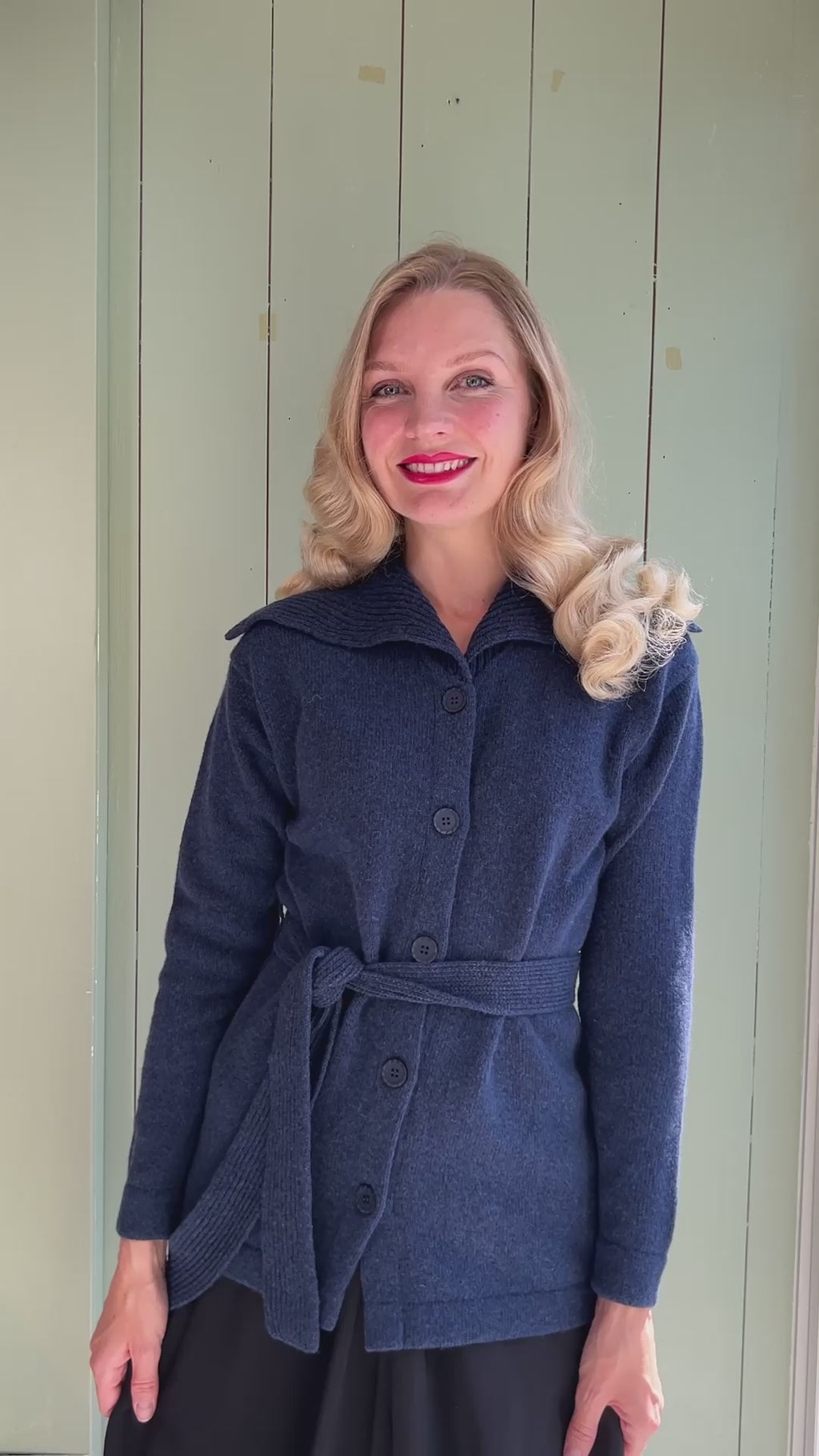 Pearl is a mid-length, everyday cardigan inspired by the early 1920s, crafted from lightweight, soft merino wool. It features a classic 1920s-style wide collar and a straight silhouette, fastened with a belt. The design includes five detailed buttons and long, slim-fitting sleeves. This versatile piece works perfectly as a jacket on warm summer days and as a cosy indoor layer during colder months. Beautiful when paired with skirts, trousers, or worn over dresses.