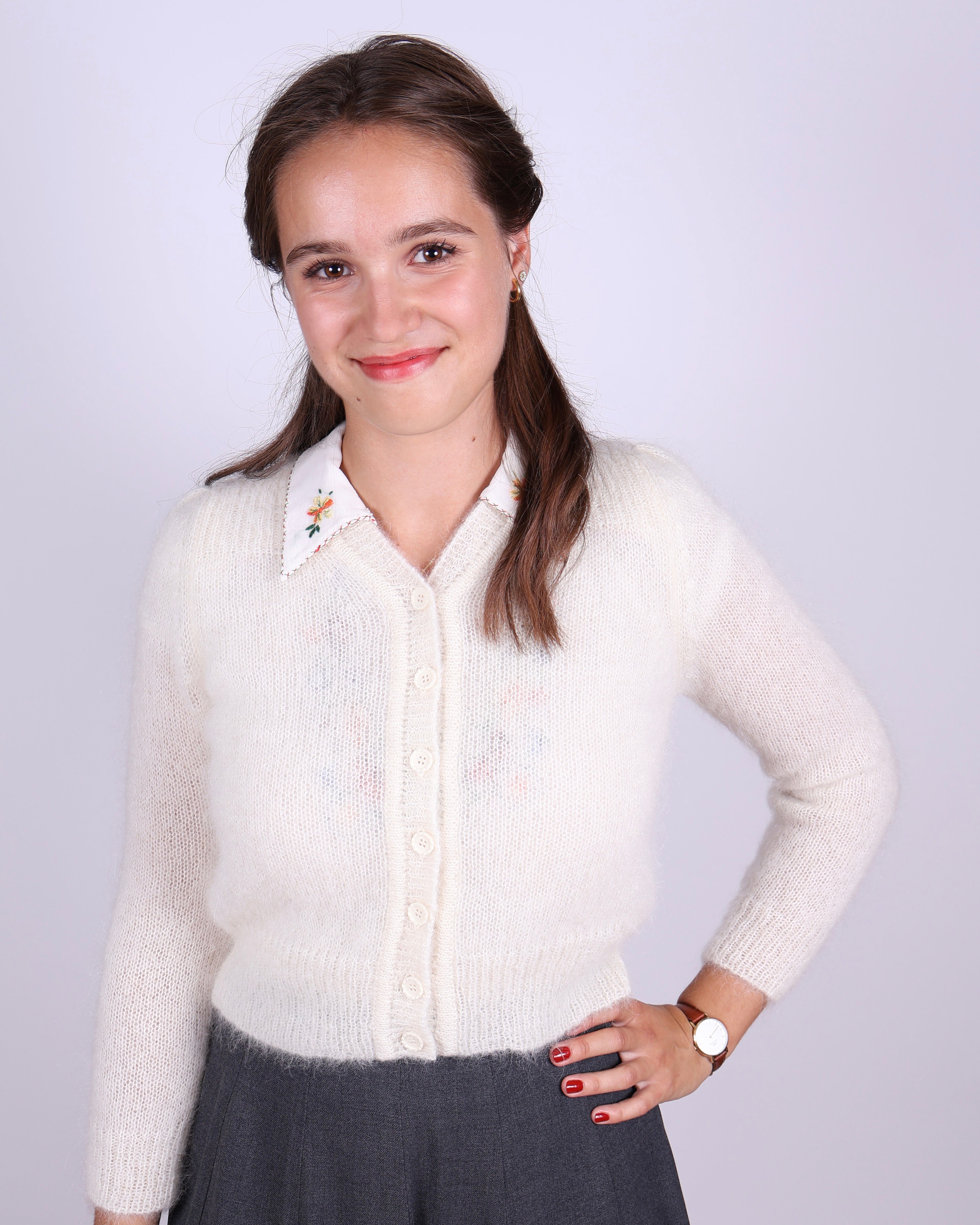 With a Memery knit, you get high-quality craftsmanship in a beautiful and timeless design, inspired by fashion from the 1920s to the 1950s. These blouses are designed with versatility in mind and can be worn all year round, whether in summer or winter, layered over dresses, skirts, or trousers. The fit is tailored to highlight the woman’s natural, curvy silhouette, and the colours are carefully chosen to blend seamlessly with a classic, everyday wardrobe.