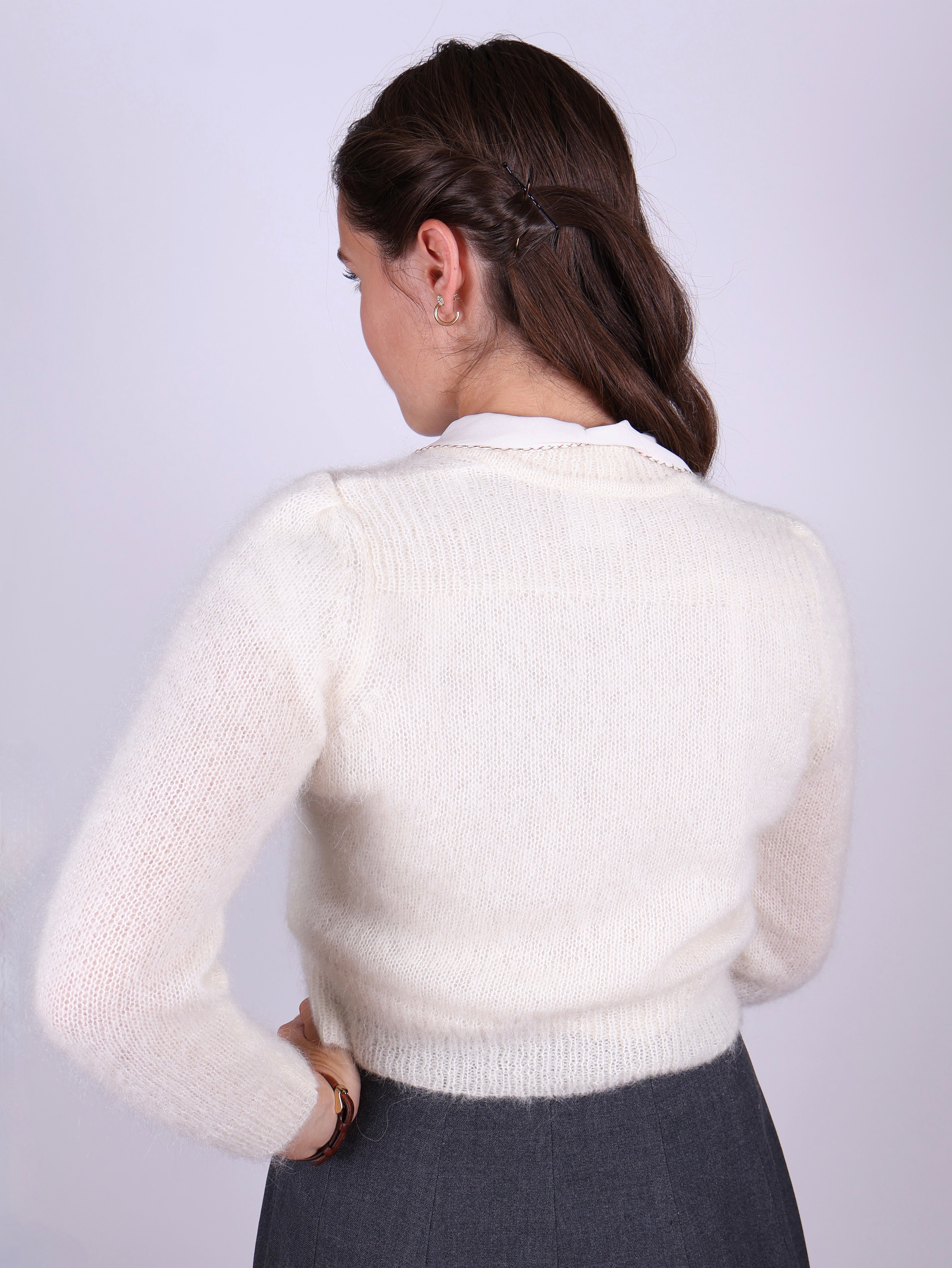 This 1940s- and 1950s-inspired cardigan is made from a lightweight mohair blend and features a feminine silhouette, a V-shaped neckline, and seven small buttons down the front. The slim-fitting puffed sleeves are finished with ribbed edges, and the cropped length from shoulder to hem creates a flattering look.