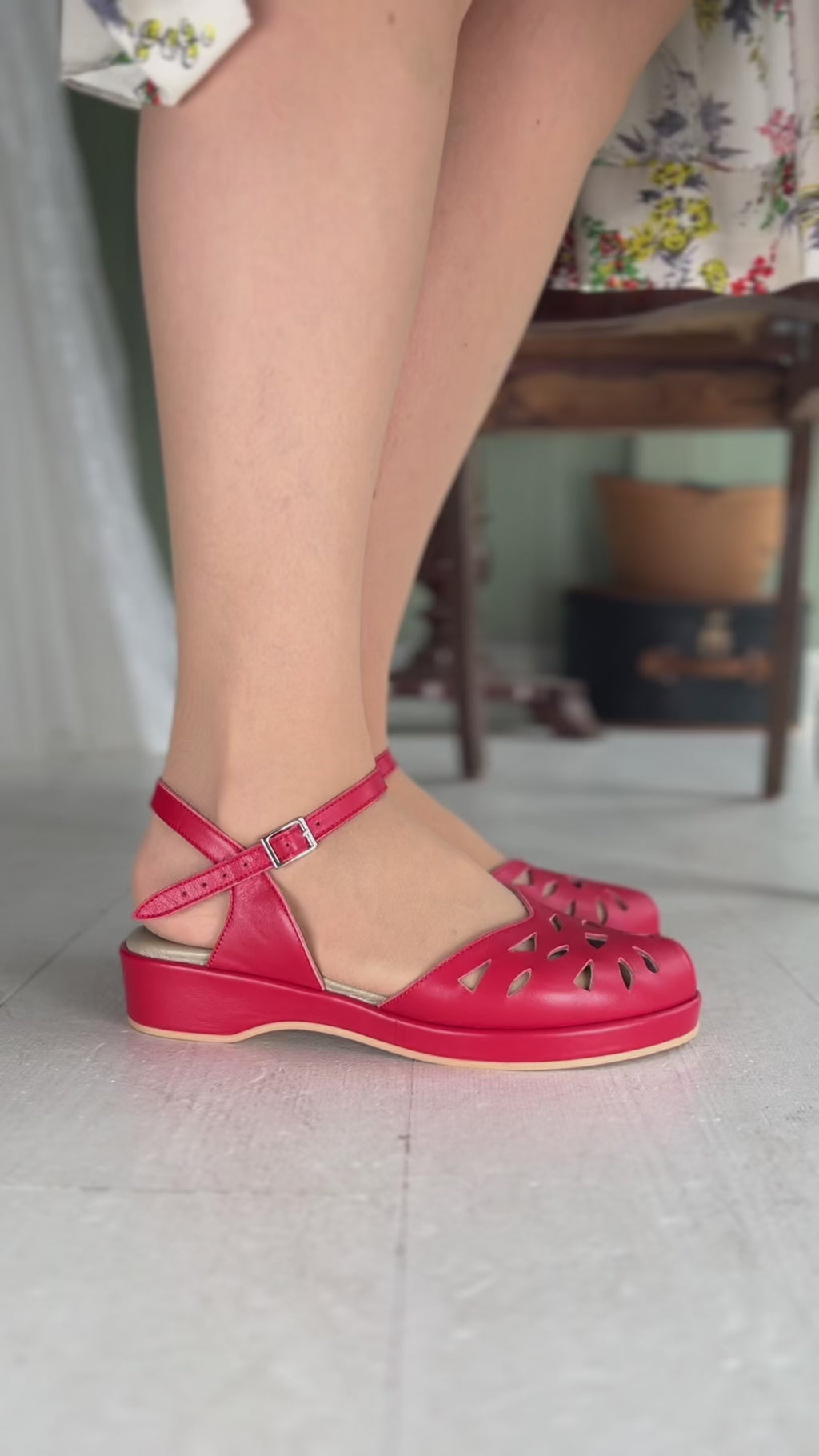 Classic summer wedges inspired by the late 1940s and early 1950s. Crafted from full-grain leather, these sandals feature an elegant cutout pattern that enhances their feminine appeal. With peep toes and a secure, adjustable ankle strap, closed with a metal buckle, they offer both style and comfort. The soft silicone inserts beneath the leather sole ensure a cushioned fit, making these shoes perfect for all-day wear.