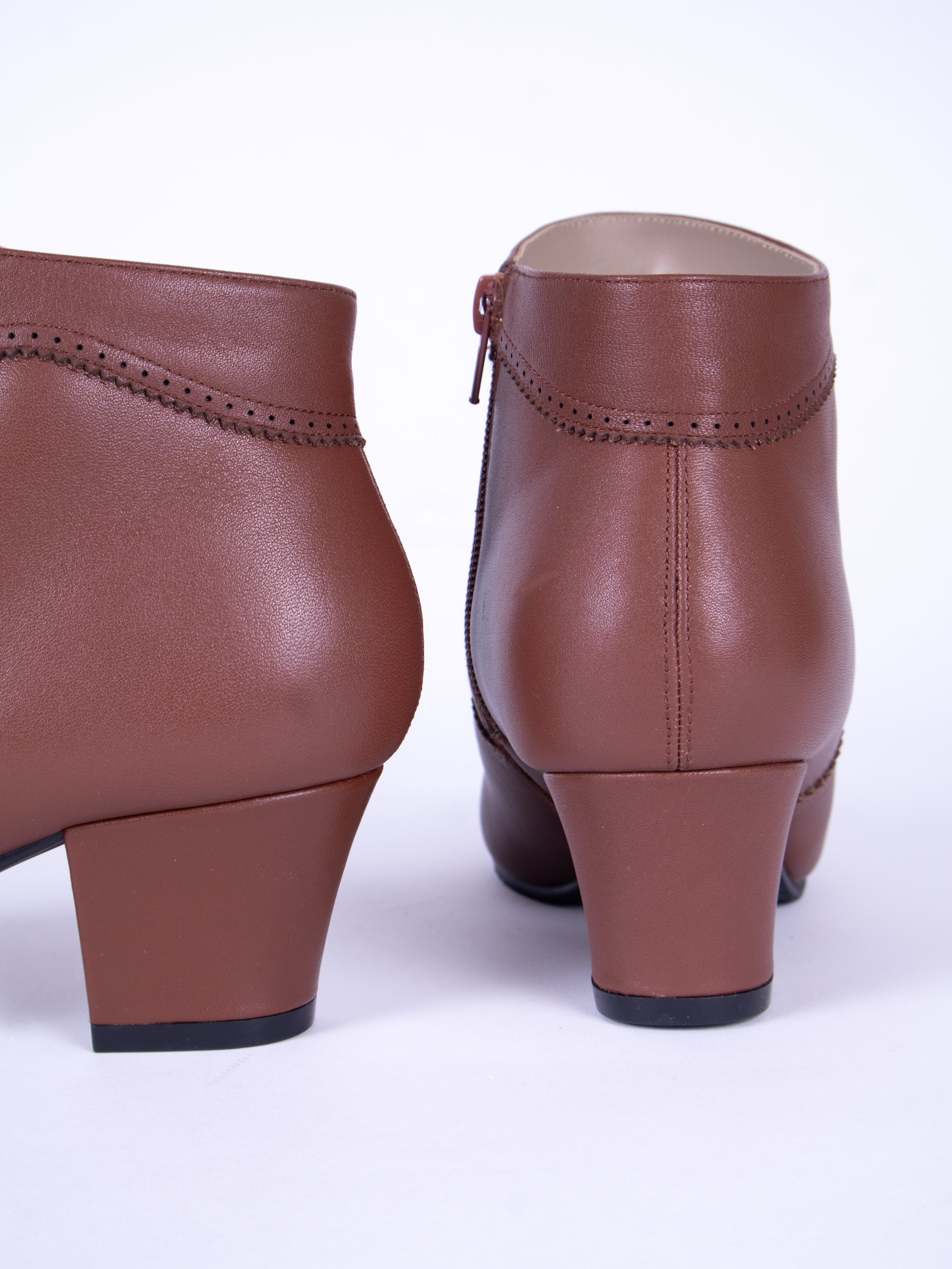 The boot features a rounded, spacious toe cap, decorative brogue detailing, and a slim-fitting short boot shaft. For easy fastening, the boot has a metal zipper on the inner side. The sturdy, slightly curved, medium-high heel and the short, close-fitting shaft give the boots an elegant, sophisticated look.