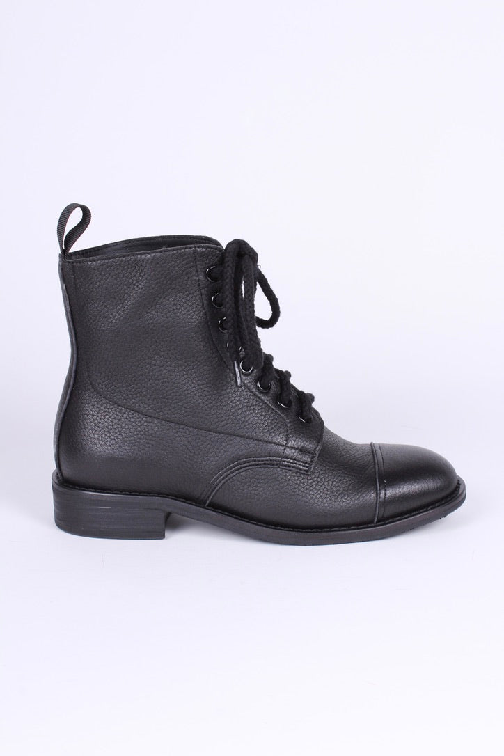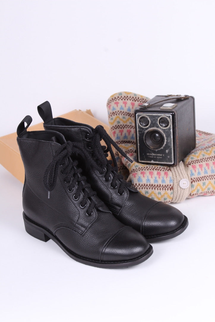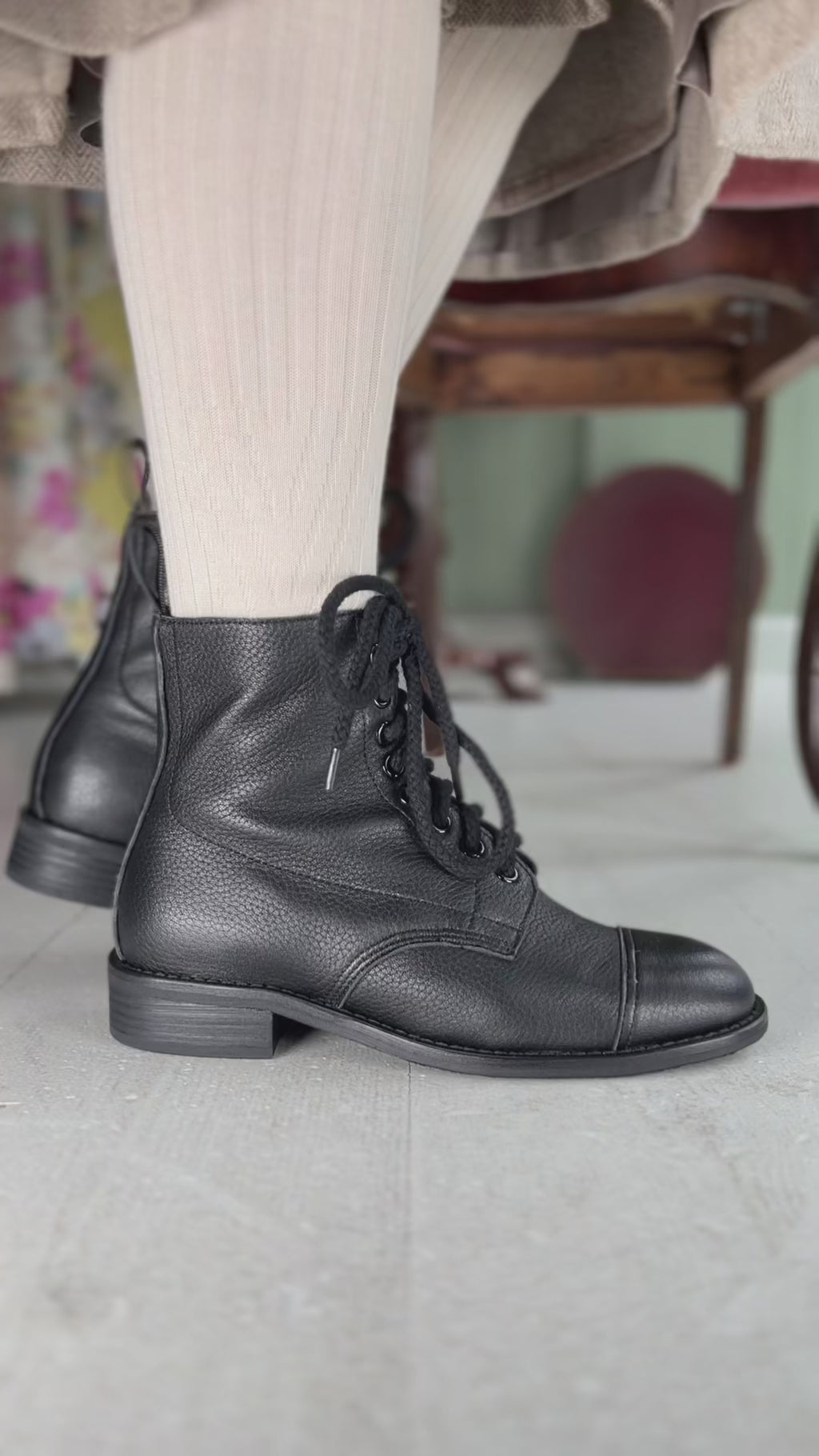 Introducing Robbie, an authentic WWII 1940s-inspired leather lace-up boot. These sturdy, casual boots are crafted from full-grain structured leather and feature a rounded toe cap, a slim-fitting shaft, eight pairs of metal eyelets for the laces, and durable rubber outsoles.