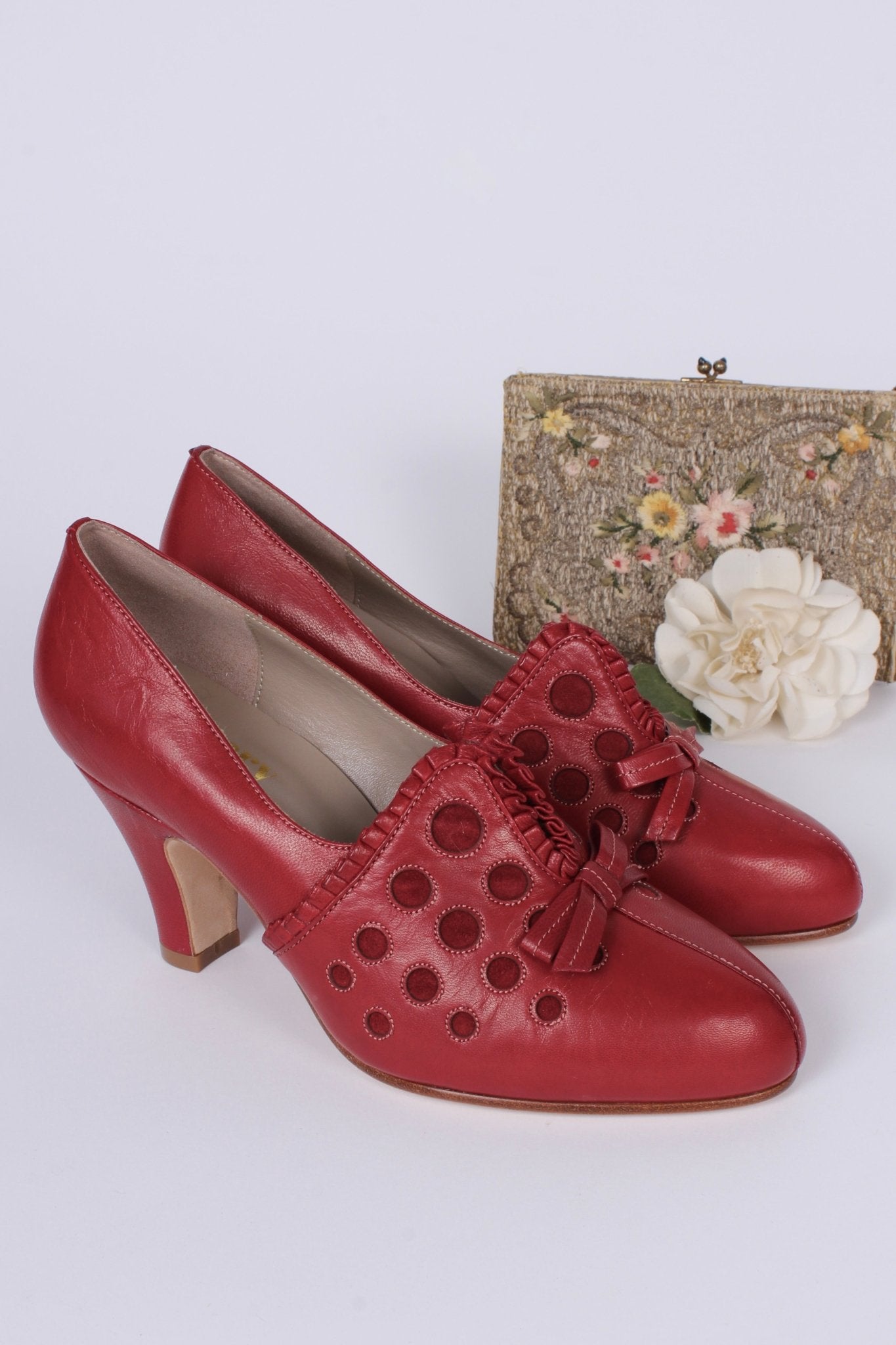 These classic early 1930s Art Deco-inspired high heels feature a pointed toe box, a low instep, and beautiful handcrafted suede circle details on the vamp. Elegant medium-high Spanish heels give the shoes a truly glamorous 1930s expression, while a bow and frill on the vamp add an extra touch of charm.