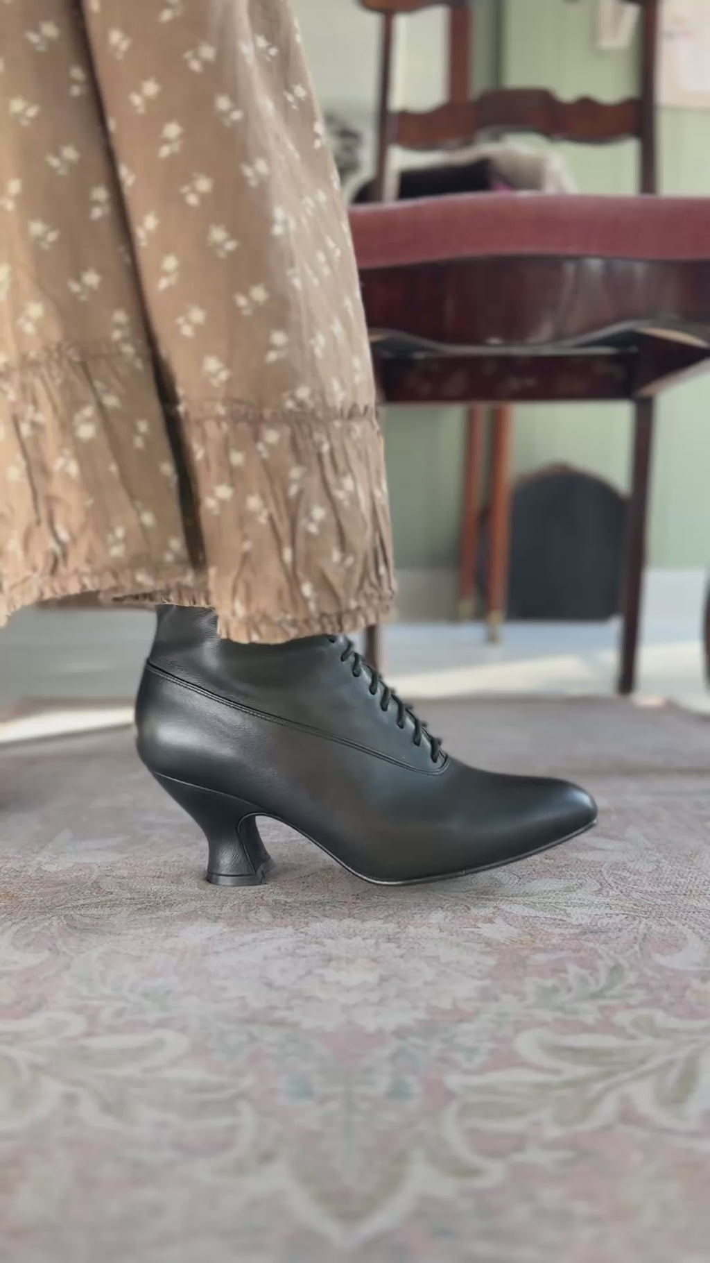 Der Absatz ist eine Kopie eines Originalabsatzes aus dieser Zeit, die Form entspricht also hundertprozentig der Edwardianischen Zeit. Der Absatz ist sehr ausgewogen und bietet beim Gehen großen Komfort.